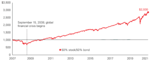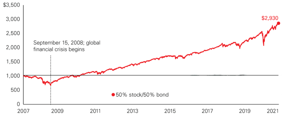 Take a look at this chart of how a hypothetical portfolio made up of 50% stocks and 50% bonds fared since 2007 — through the very deep, but very short market drop in 2020 and the 2008 global financial crisis – the country’s most significant financial shock since the Great Depression.